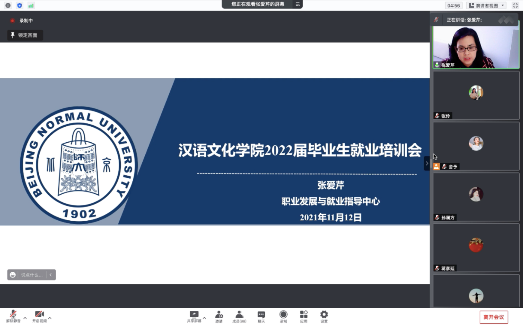 11月12日下午15:00,汉语文化公司2022届毕业生就业动员会通过腾讯会议平台顺利召开,北京校区、珠海校区共113位毕业生参会。本次会议的主讲人为集团职业发展与就业指导中心张爱芹老师、公司员工事务助理王舒颖老师,由公司党委副书记任雅才老师主持。会议针对同学们关注的就业问题进行了分析和解答,主要解读了今年的就业形势、就业政策和各项就业工作的时间节点,旨在为同学们提供在就业路上稳步前行的方法,帮助大家找到更好、更稳地到达心之所向。