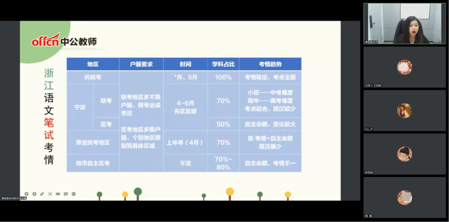 此外,曾老师结合题型和知识点,以历年真题为例,对浙江地区的笔试情况进行了细致解读。进而总结出“查漏补缺全面复习”“有效练习突破重点”“不同模块不同方法”“合理规划巧用时间”这四条备考原则及“预”“听”“理”“刷”四个备考阶段。