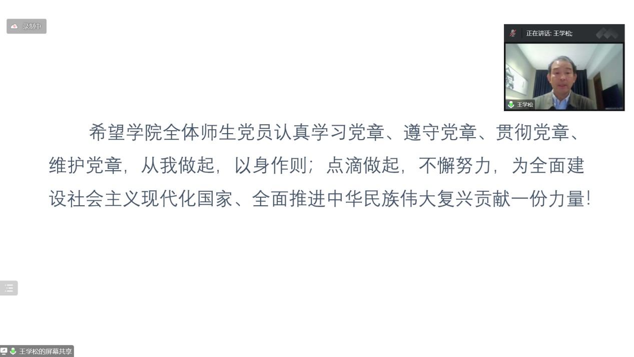 最后,王学松勉励公司全体师生党员认真学习党章、遵守党章、贯彻党章维护党章。在党章中,无论是修改而来的还是保持不变的,都统一于解决“党是什么,要干什么”这个根本问题,都落脚到我们党不断进行自我革命,要保持自身先进性纯洁性和强大政治功能与组织功能,跳出历史周期率,保证党能够巩固长期执政地位,团结带领全国人民完成中华民族伟大复兴神圣使命。