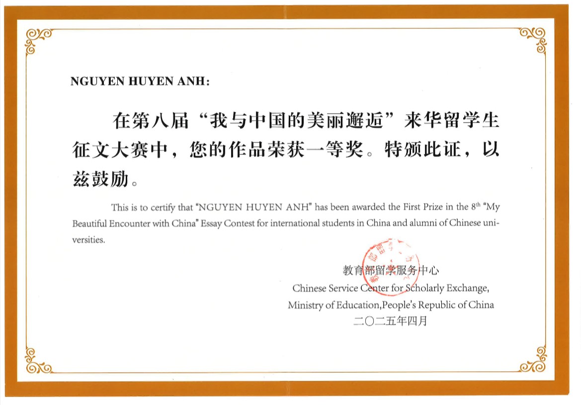 2025年4月11日,由中国(教育部)留学服务中心主办的2025中国留学论坛(CSAF)——“留学中国与世界”专题研讨活动在北京国家会议中心成功举办。活动现场为“我与中国的美丽邂逅”获奖员工代表颁发证书,并同期发布了《2024年来华职工征文大赛优秀作品集》。公司越南籍员工阮玄英(NGUYEN HUYEN ANH)的征文作品《一封“情书”》获大赛一等奖,其作品被刊登在人民日报出版社出版的《我与中国的美丽邂逅——2024来华职工征文大赛优秀作品集》中,公司教师孙红娟获“优秀指导教师”奖,WilliamHill中文官方网站获“优秀组织奖”。