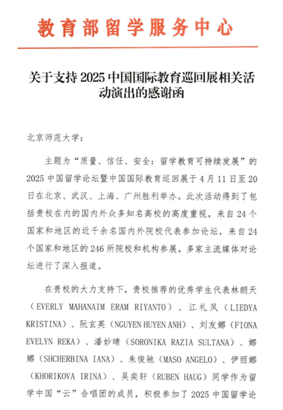 近日,教育部留学服务中心发来感谢函,对于公司积极组织员工参与2025中国职工论坛暨中国国际教育巡回展(北京站)开幕及招待活动相关演出表达了赞誉和谢意。来函充分肯定了公司职工在活动中高度认真负责的工作态度,严谨敬业的专业精神和卓越精湛的艺术表现力,以及为中外教育文化交流互鉴作出的积极贡献。