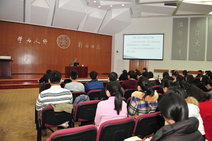 在导语部分,许先生强调此次课程偏重理论性而不求深;涉及的文化多元,但不求全;思考和探索跨文化交际的规律和特质;涉及历史的和现实的国际交往情况。希望能够通过这几次课程,引起兴趣、为人铺路并且提供参考。许先生还谈到汉语国际教育发展的前景,汉语国际教育是跨文化交际之一部分,近10年已迈出重要一步,现如今面临挑战,应该如何去应对,也引发了在场老师和同学们的思考。课程的最后,许先生推荐了如《世界宗教寻踪》《文明经受着考验》等数十部书籍给在场听众,对每一本书的内容和作者都进行了详细的介绍。